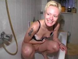 Die versaute Schlampe beim Solofick mit einer Badebürste unter der Dusche