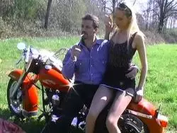 Blondes Weib wird im Grünen in die haarige Pussy genagelt