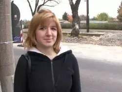 Der unbekannte Macker bequatscht das sexy Mädchen von der Straße zum Strippen vor der Kamera