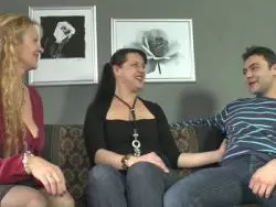 Der Amateurhengst genießt den Blowjob durch zwei kurvige Hobbynutten gleichzeitig