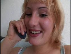Junge hübsche Frau telefoniert und zeigt ihre glitschige Fotze