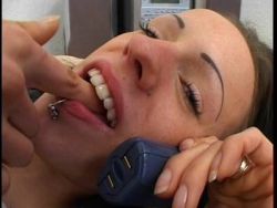 Am Telefon rubbelt sich die gepiercte Bitch ihre haarlose Muschi